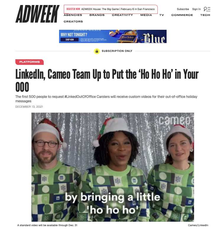 LinkedIn asked us to help them disrupt the holidays and drive social buzz and earn headlines. So, we uncovered from a social poll that a lot of people struggle taking time off and staying off email when they do. So, to promote a healthy work-life balance among LinkedIn’s community we created the LinkedI Out of Office Carolers on Cameo. Users simply chose from a list of reimagined holiday hits, input their names and other info to receive a free customized OOO carol to let people know they were NOT working from Ho Ho Home or anywhere near a laptop until the new year. Truly a gift that kept on giving AND one that left some headlines in our stockings.
